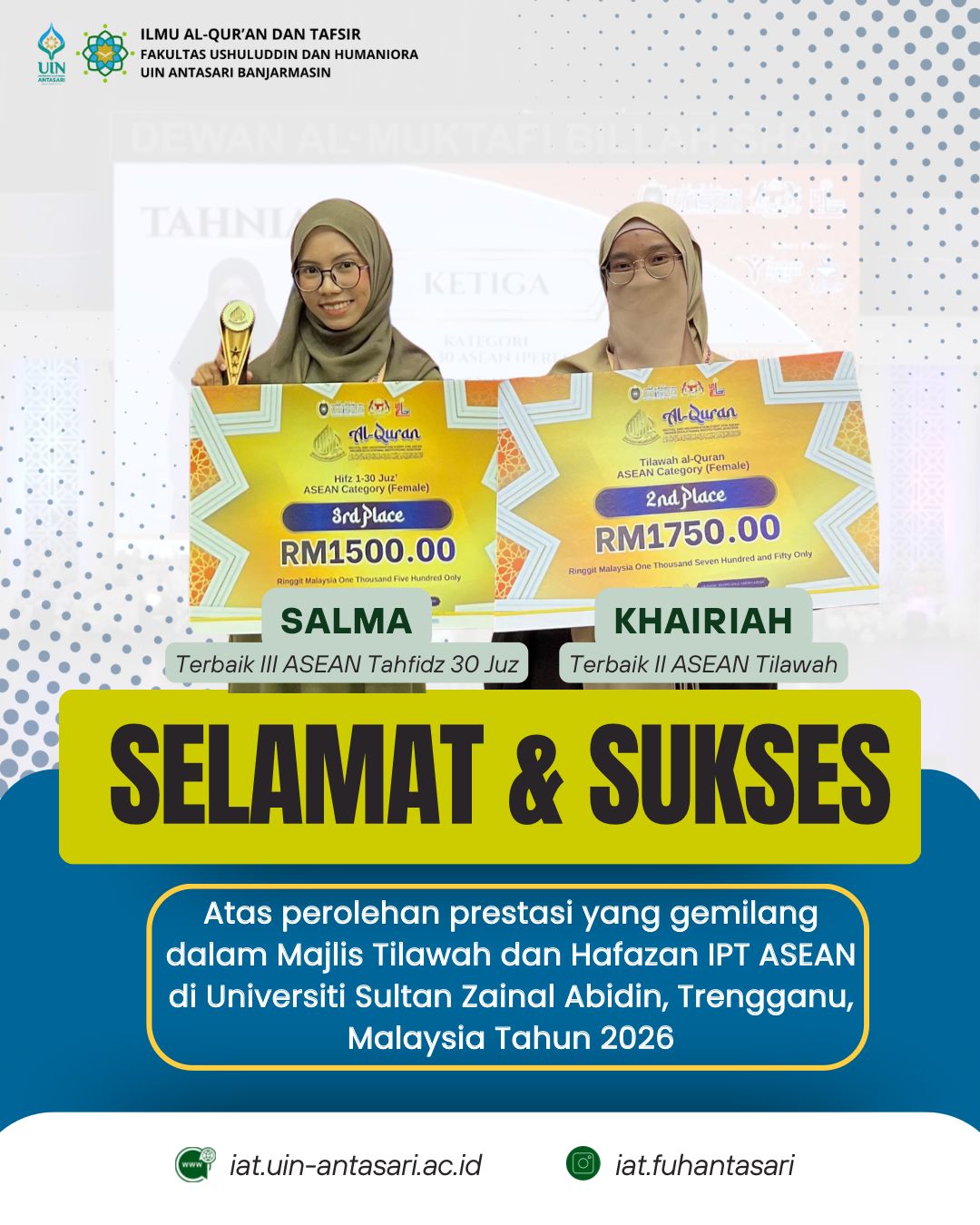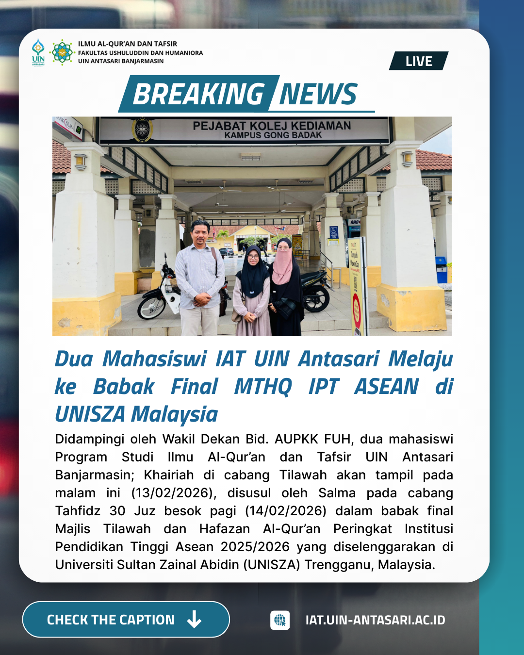 MALAYSIA – Kabar membanggakan datang dari mahasiswi Program Studi Ilmu Al-Qur’an dan Tafsir (IAT) UIN Antasari Banjarmasin Fakultas Ushuluddin dan Humaniora yang berhasil menorehkan prestasi gemilang pada ajang Majlis Tilawah dan Hafazan Al-Qur’an (MTHQ) Institusi Perguruan Tinggi ASEAN 2026 yang …