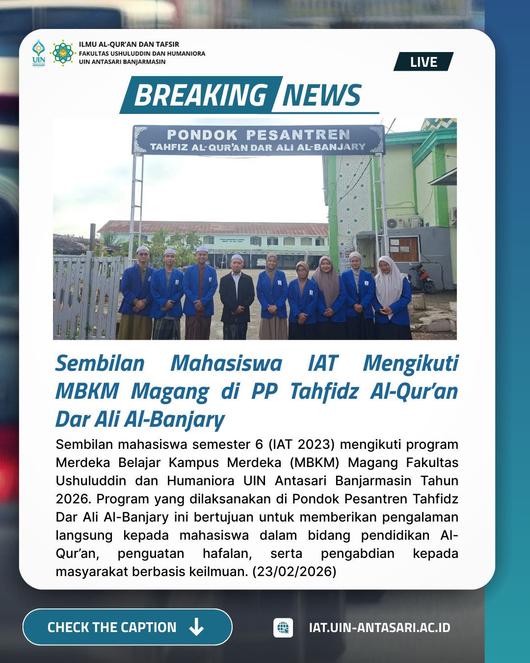 BANJARMASIN – Sebanyak sembilan mahasiswa Program Studi Ilmu Al-Qur’an dan Tafsir (IAT) semester 6 (angkatan 2023) Fakultas Ushuluddin dan Humaniora UIN Antasari Banjarmasin resmi memulai Program Merdeka Belajar Kampus Merdeka (MBKM) Magang Tahun 2026 di Pondok Pesantren Tahfidz Al-Qur’an Dar …