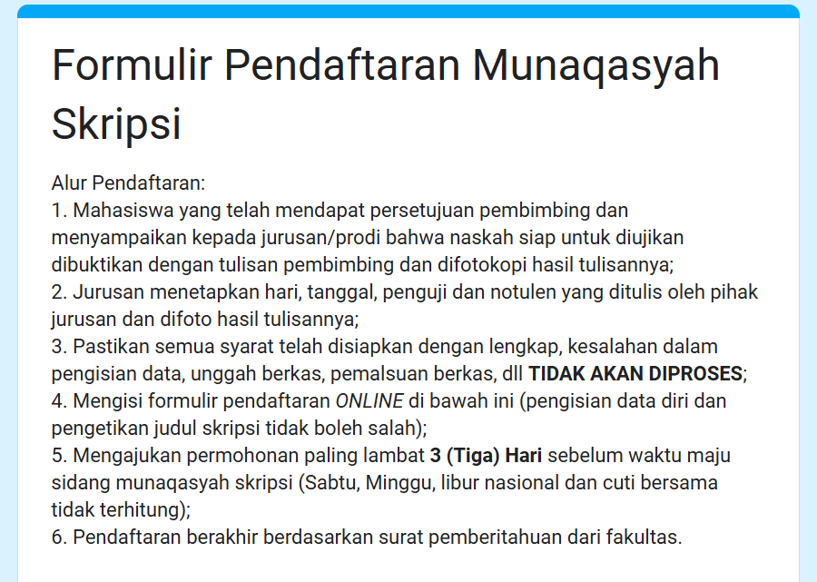 - Mengajukan permohonan paling lambat 3 (Tiga) Hari sebelum waktu maju sidang munaqasyah skripsi (Sabtu, Minggu, libur nasional dan cuti bersama tidak terhitung);